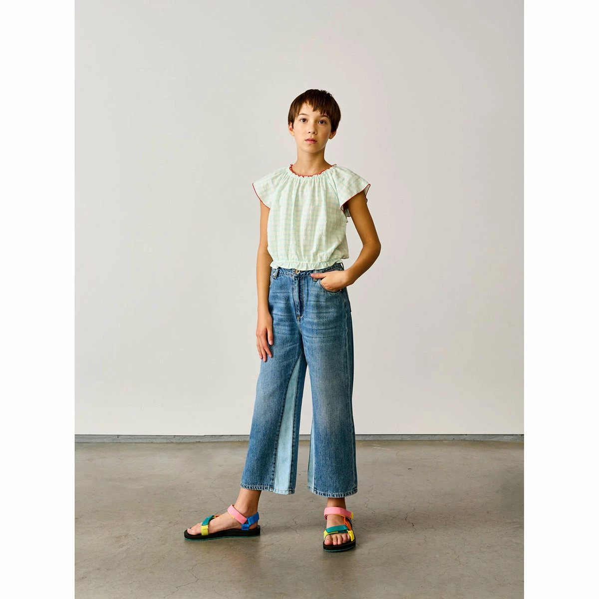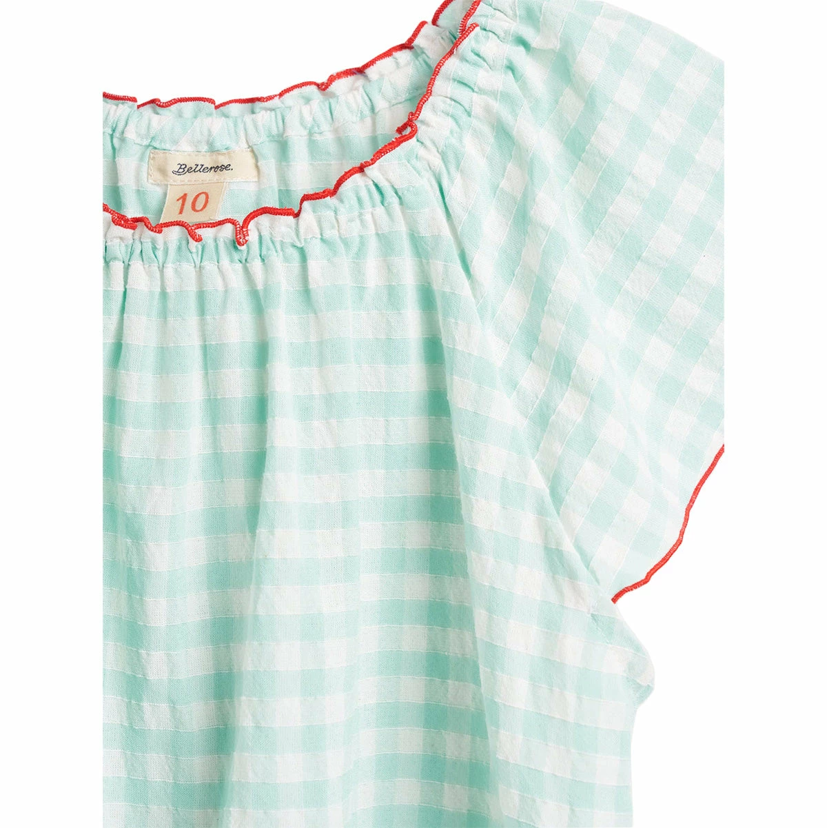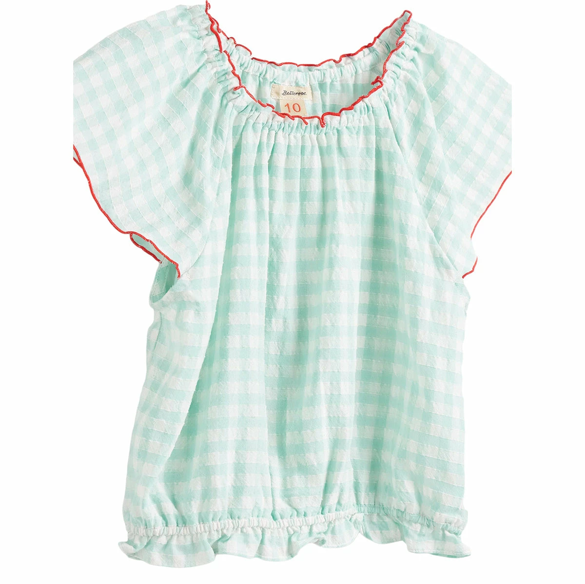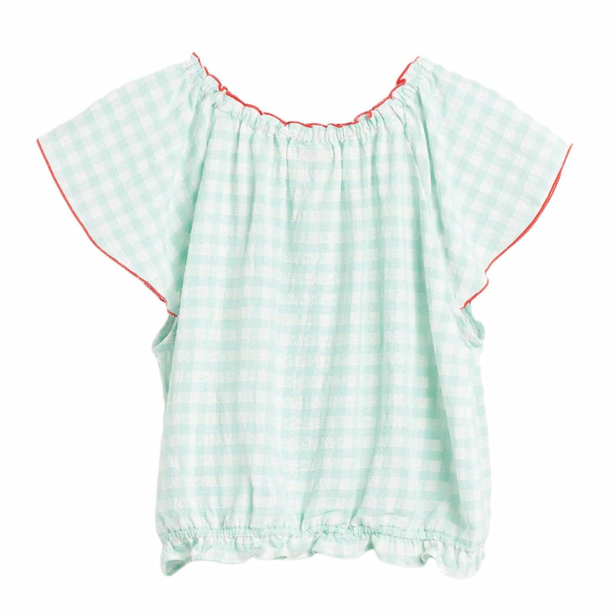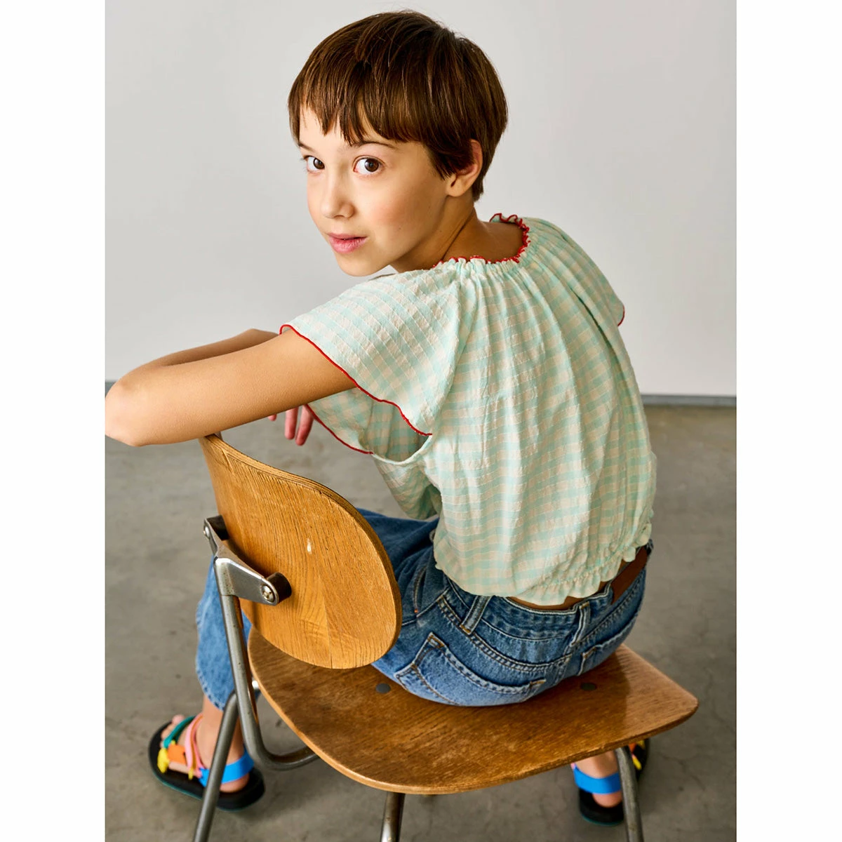 In gingham, we trust. The Poeha blouse from Bellerose sports a favourite pattern after stripes —we do love tripes— in a modern mint green iteration that screams summer weather. Crafted from a light viscose blend, it consists of a cropped cut with an elasticated waist and neckline, raised collar, and small cap-sleeves. A perfect top to layer over her favourite denim shorts or with a high-rise skirt. Details: Cropped blouse | Viscose blend | Mint green gingham pattern | Ruffled details with contrasting overlock | Elasticated waist and neckline Composition: 76% viscose, 21% cotton, 2% polyester, 1% other fibres Colour: Check C Care details: Handwash in cold water only | Do not bleach | Do not tumble dry | Iron at low temperature / Heat 110°C | Dry clean