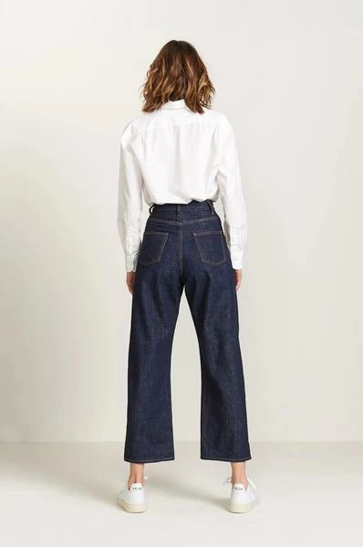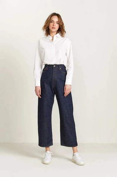 These cool denim jeans play with proportion to maximum effect! They are high waisted with a slightly cropped leg which is wide and flared. They have the traditional 5 pockets and zip fly and button closure. If you want to go for a slimmer look, take the size down from your ususal. 100% Cotton Made in Tunisia