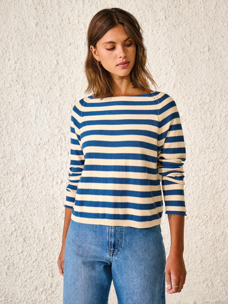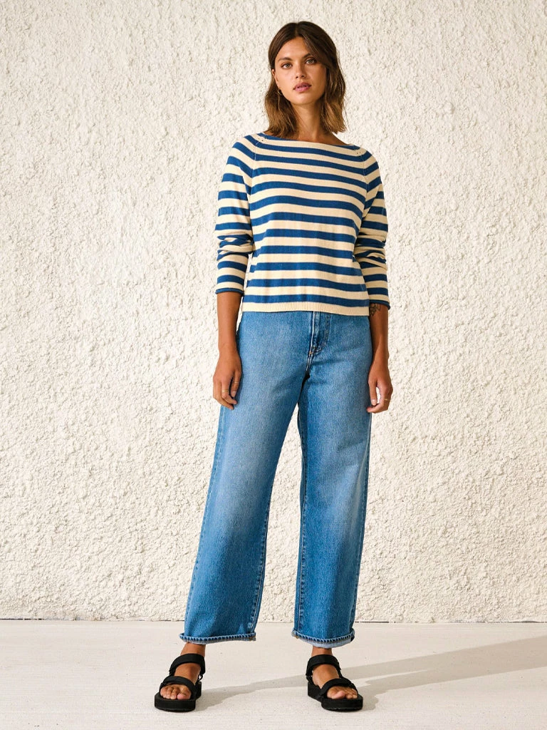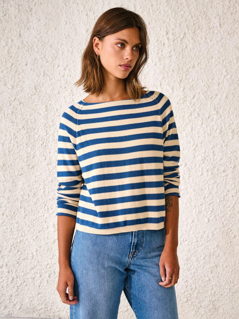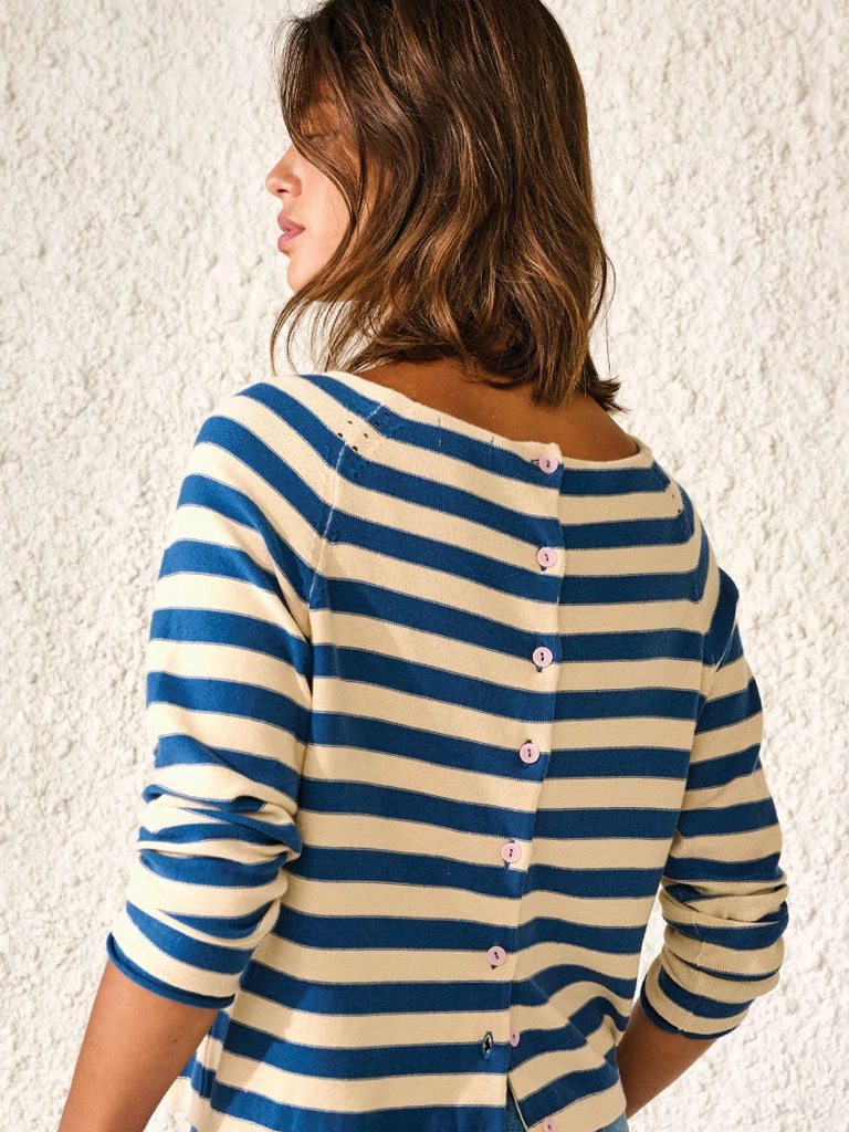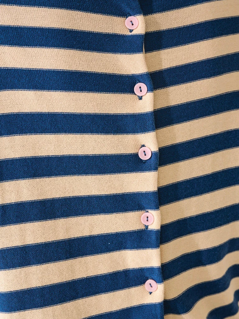 The Reacar Knit from Bellerose can be worn with the buttons in the front or back. Made from reverse-knit pure cotton and modeled to a reversible cut, this versatile cardigan features raglan sleeves, rolled edges, and a wide neckline. 100% cotton Reversible knit with wide stripes and neckline Raglan sleeves Rolled edges Machine was cold and gentle Do not tumble dry