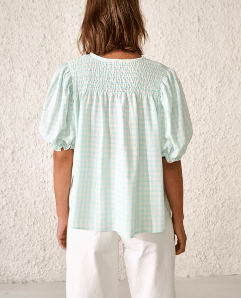 Bellerose Sasha Mint Blouse, a light greenish blue top with short puffed sleeves and a round neck. Fastening with tonal pale buttons on the front this simple gingham check Summer top has stretchy smocking across the chest and shoulders. 73% Organic Cotton & 27% Cotton Machine wash at 30 True to size