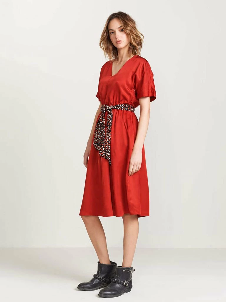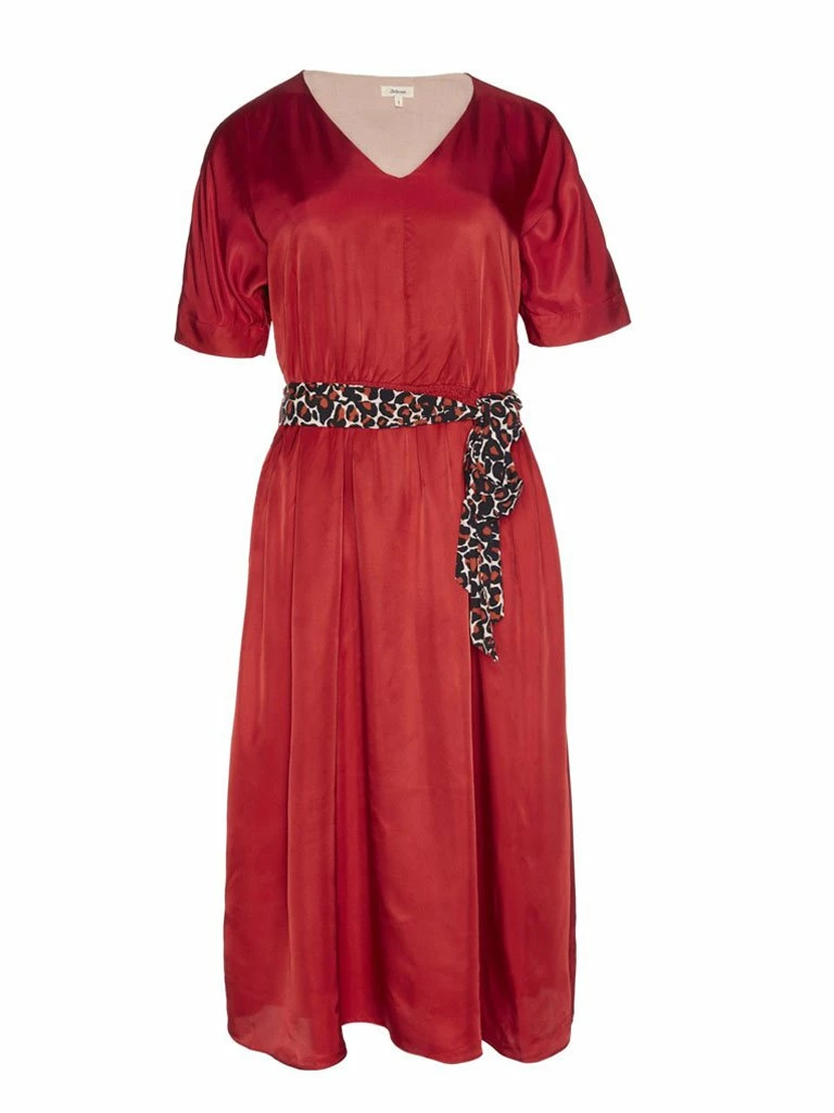 A Bellerose staple, the Hoek Dress is always a winner and this season comes in a deep, Scarlet red with contrasting leopard print belt. Cut with a flattering v-neck, this satin-feel dress is midi length, has folded short sleeves that hit just above the elbow, a gathered waist with ribbon tie belt and is fully lined with pink fabric. A fantastic addition to your wardrobe, this dress will ensure you stand out this season. 100% viscose Bodylining : 100% viscose Belt : 100% viscose Made in China Machine wash 30 degrees Do not tumble dry
