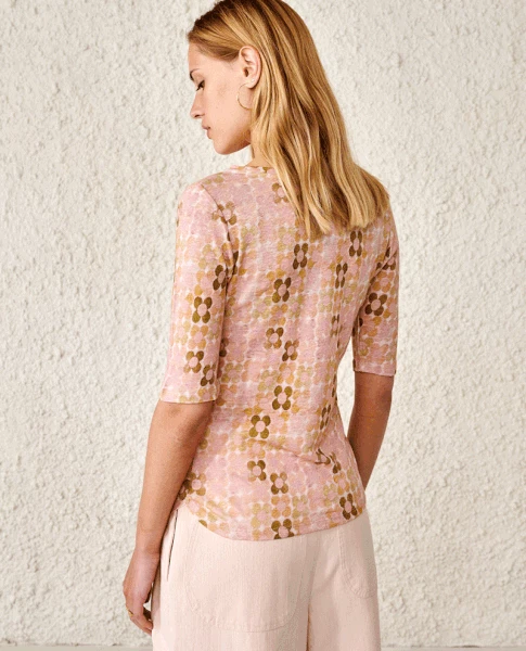 Bellerose Seas Floral T-Shirt, a light pink floral t-shirt with 3/4 length sleeves and a wide boatneck. Cut for a slim fit this lightweight linen top has an all over brown, yellow and white retro flower print. 100% Linen Machine wash cold True to size, for a looser fit then size up