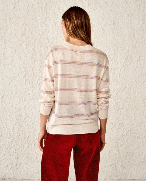 Bellerose Senia Linen Stripy T-Shirt, a loose fitting cream linen sweater with a round neck and long sleeves. Crafted from lightweight linen this thin pullover has stripy cuffs and a striped neckline. Also comes in a lilac colourway. Lightweight linen Long sleeves Loose fit Round neck Striped hem, cuffs and neckline 100% Linen Hand wash True to size