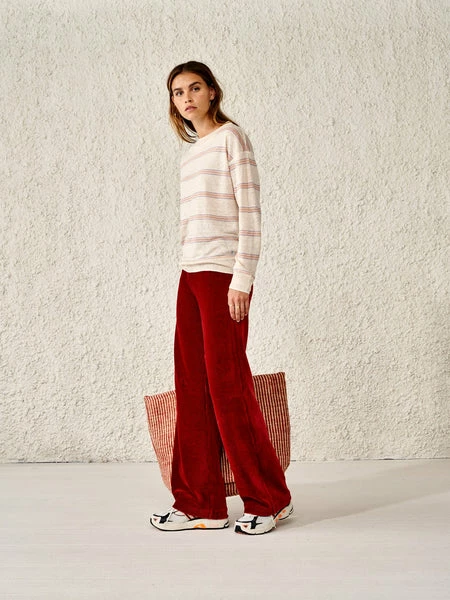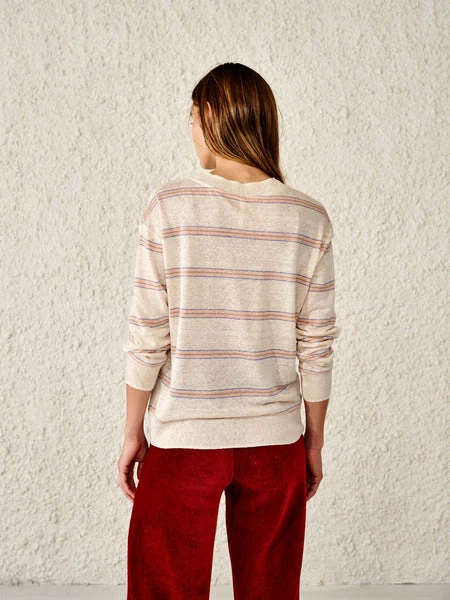 This 100% linen tee features a relaxed cut with dropped shoulders and colorful ribbed edges to land on the perfect balance between a basic tee and a trendy sweatshirt look. This seasonal version comes in an array of stripes in cream, peach and blue. Enjoy yours with your favorite denim or try it with a skirt for a change. Sizing:0 (XS)1 (S)2 (M)3 (L)4 (XL)5 (XXL) 100% Linen Made in China Machine wash at 30°C or lower, low bleach allowed, do not fill the drum, delicate spin Do not bleach Do not tumble dry Iron at low temperature/ heat 110°C Do not dry clean