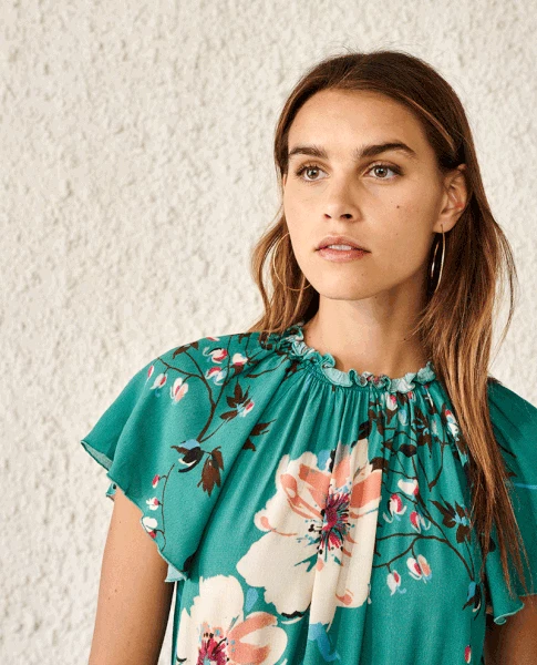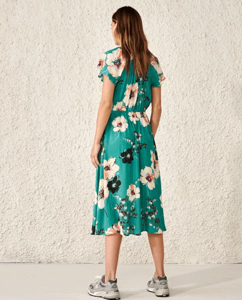 Bellerose Sofie Floral Dress, a bright green flowery print midi dress with short flutter sleeves and a high frilly neck. This mid length green sundress features an elasticated waistband. Mid length Short sleeves Round frilled neckline Floral print Stretchy waist Belt not included 100% Viscose Machine wash cold True to size