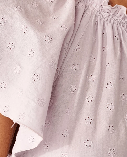 Bellerose Sofie Iris Dress, a light purple midi dress with short flutter sleeves and a high frilly neck. This mid length lilac sundress is covered in a delicate floral Broderie Anglaise style pattern and features an elasticated waistband. Mid length Short sleeves Round frilled neckline Subtle floral print Stretchy waist 100% Cotton Machine wash cold True to size