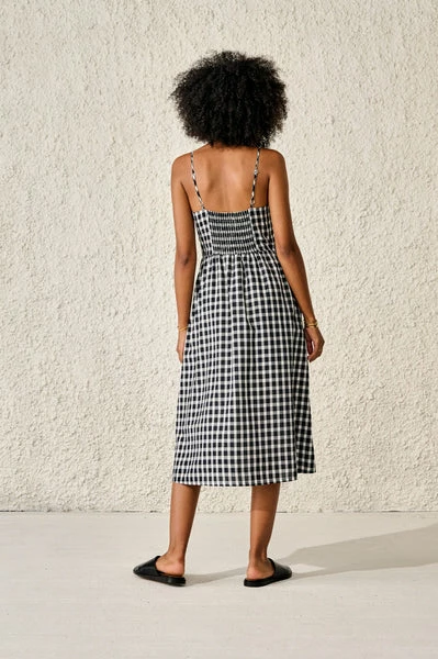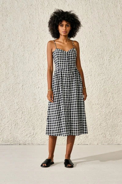 Crafted from a B&W gingham print cotton and Lyocell blend, with a fitted bodice, skinny straps, button front, and midi length, it exudes a mix of french riviera vibes and dolce vita. We love the graphic touch of the pattern and the comfort of the elasticated back. Skinny strap dress Cotton and Lyocell blend Midi length Fitted bodice Mother of pearl buttons Elasticated back BRICS & WASHING 56% cotton 44% lyocell Body lining : 100% viscose Made in Europe Machine wash at 30°C, very delicate wash Do not bleach Do not tumble dry Iron at medium temperature / Heat 150°C Dry clean P with care
