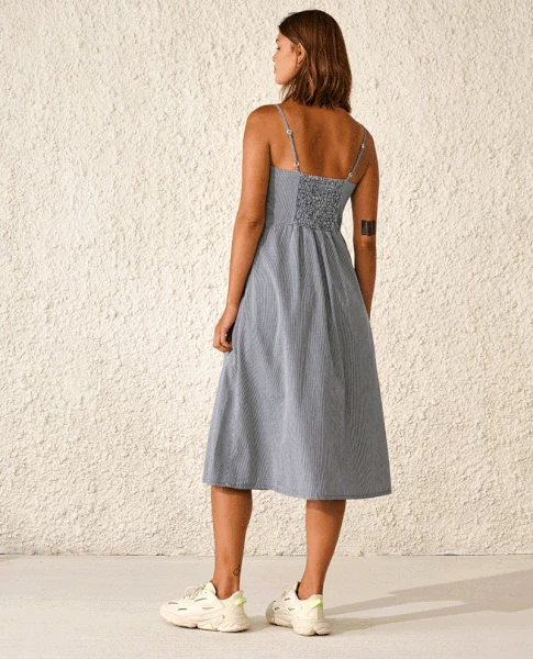 Bellerose Solal Striped Dress, a blue and white cotton sundress with thin adjustable straps and a stretchy smocked back panel. Buttoning down the front the Solal dress has a sweetheart neckline and a defined waist. 100% Cotton Machine wash at 30 True to size