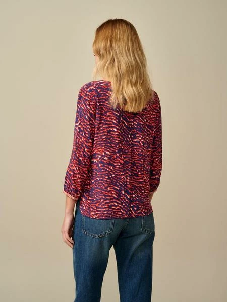 Print: Tiger stripe (Blue,Red and White) Fitting: Regular/Loose Sleeve Length: 3/4 Sizing: 1 (S) 2 (M) 3 (L) 4 (XL) A lovely blouse with bold tiger stripe print in blue, red and white. Note the contrasting colourful cuffs and curved high-low hem. This blouse will spice up any simple jeans. The perfect go to. We also have this Solong Blouse in a Pastel Animal print.