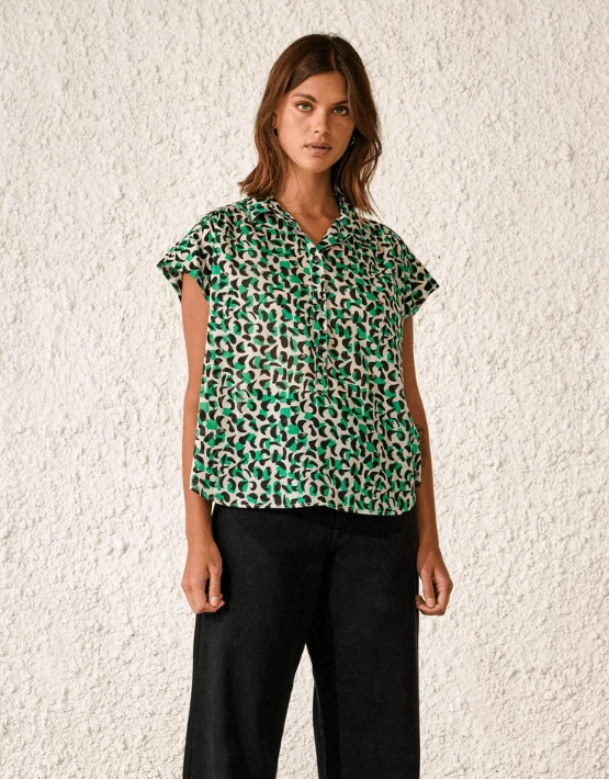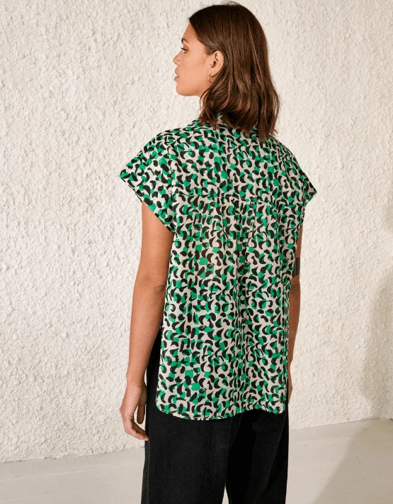 – Relaxed top – Classic collar – Cap sleeves – Half button placket – Curved hem – Abstract leopard print – Green/black – 100% Cotton – BELLEROSE Sizing: XS – 0 S – 1 M – 2 L – 3 XL – 4 RD Size: L