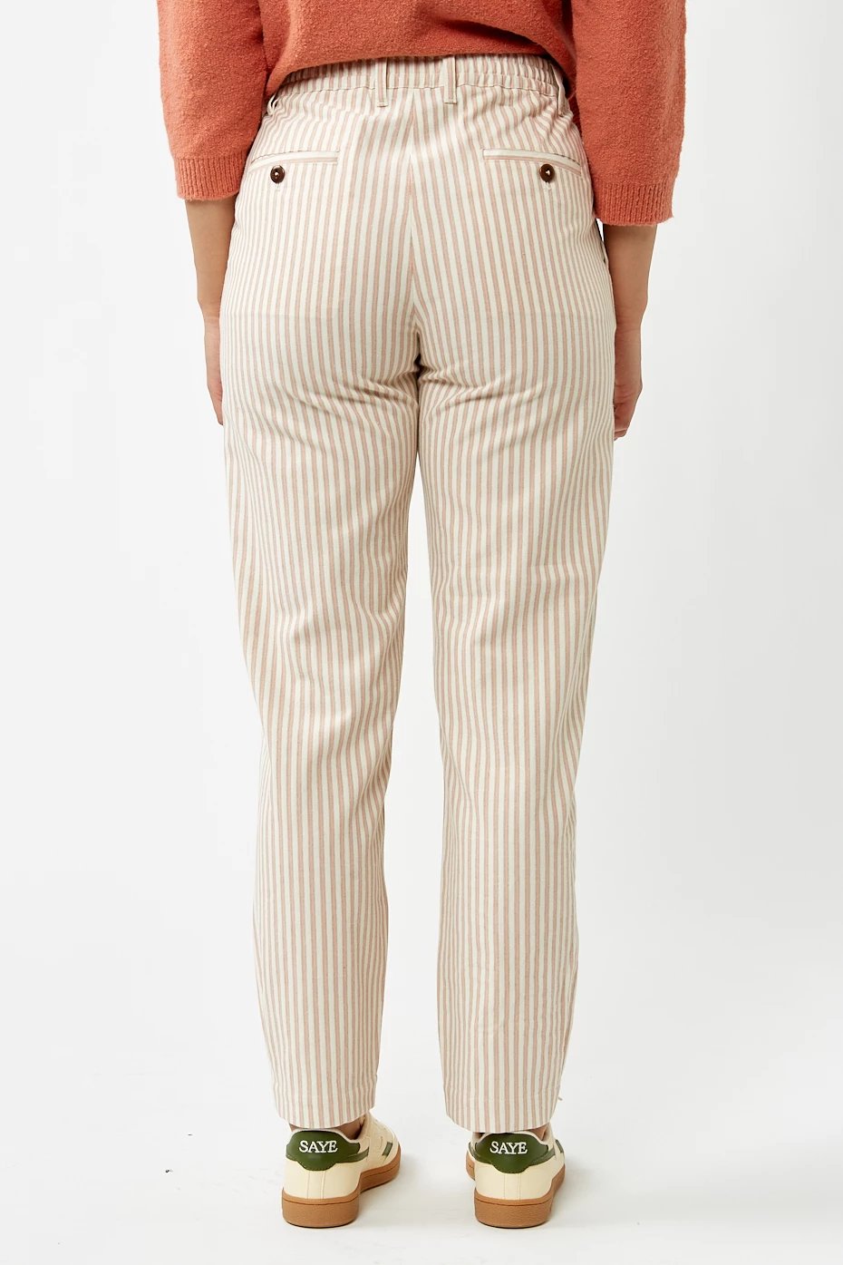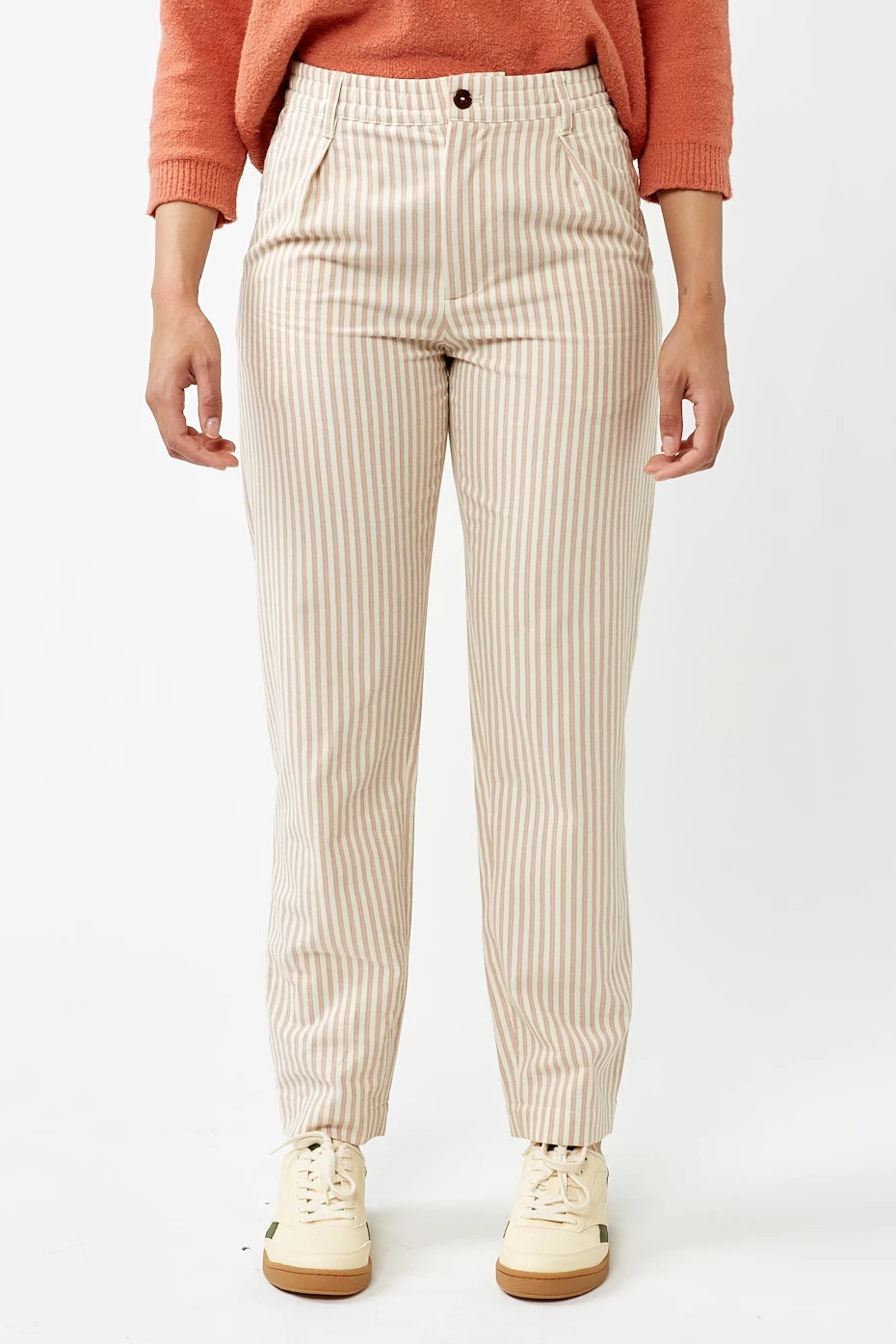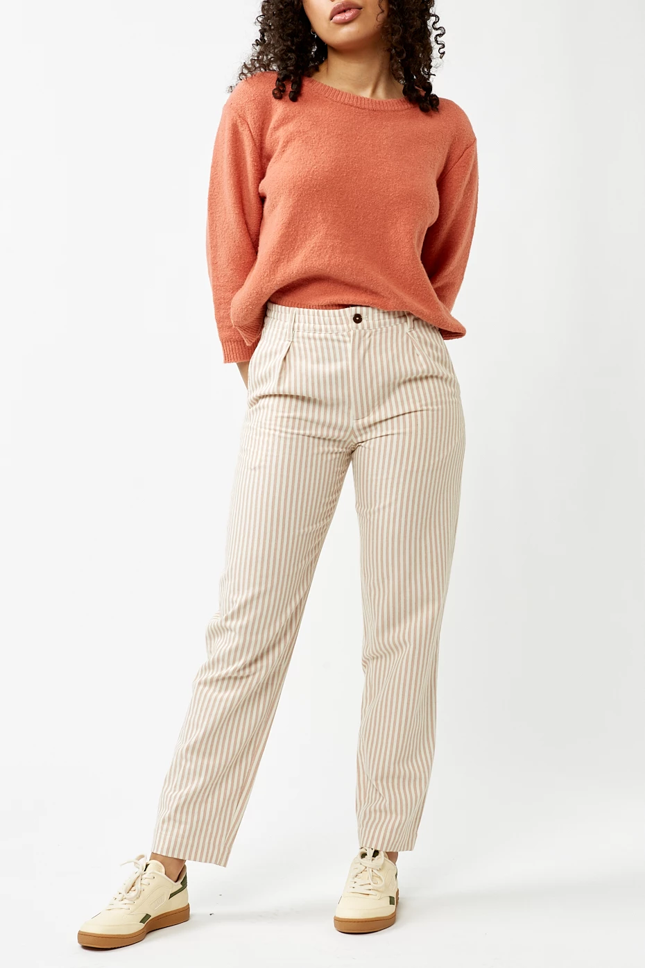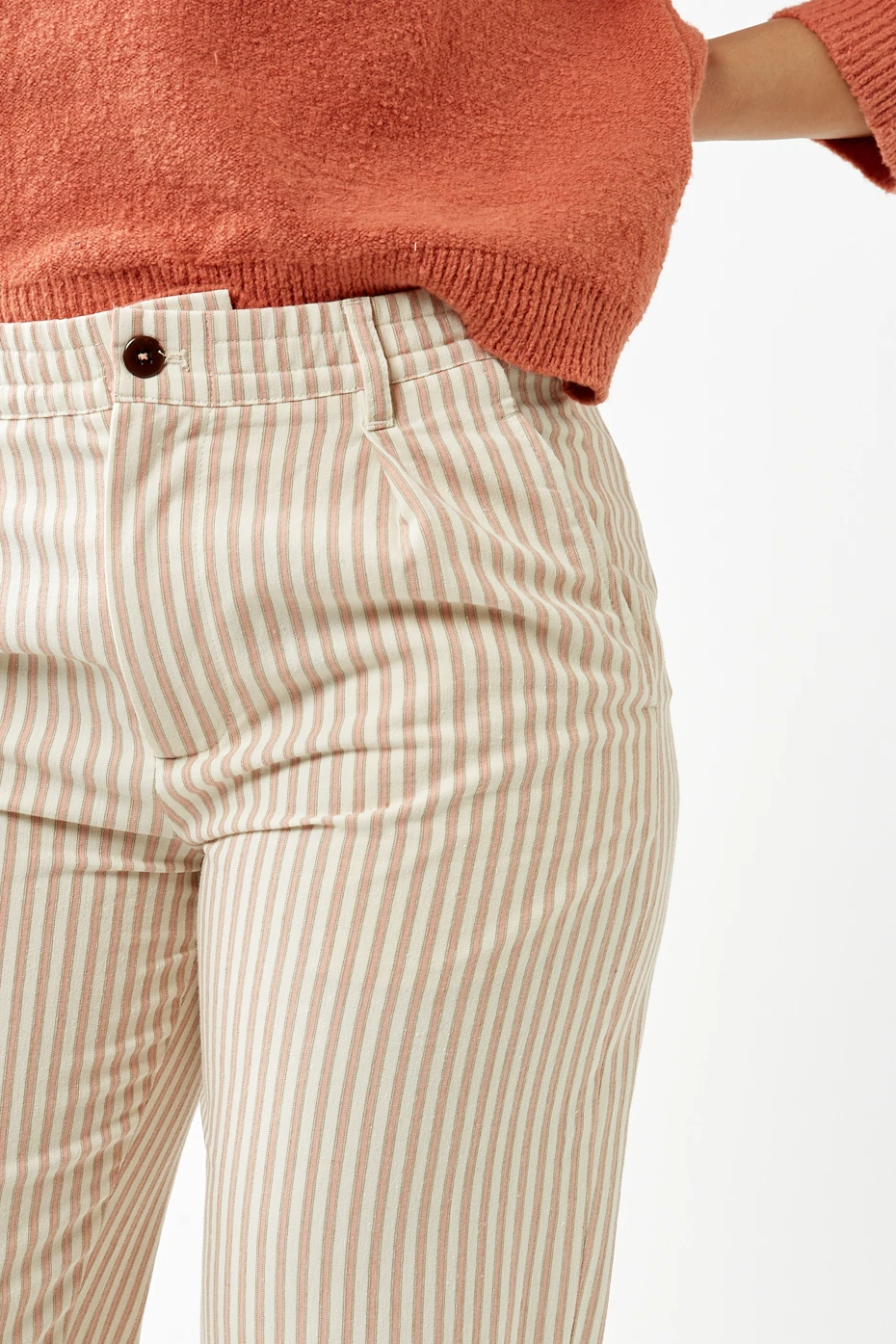 Villa are a pair of tapered pants from Bellerose, featuring a high waist, slightly cropped legs, pleated front, side pockets and welt back pockets. They’re cut from a classic stripe cotton blend that mixes masculine styling with a feminine edge, perfect for pairing with loafers and a crisp white shirt.