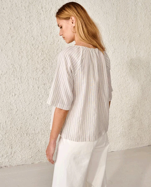 Bellerose Stuart Blue Stripe Blouse, an off white and light blue striped cotton top with a floaty and loose fit and a round neck. Lightweight and delicate this vintage look blouse is airy and perfect for warm Summer days. 91% Organic Cotton, 5% Polyester & 4% Cotton Machine wash at 30 Size down if between sizes