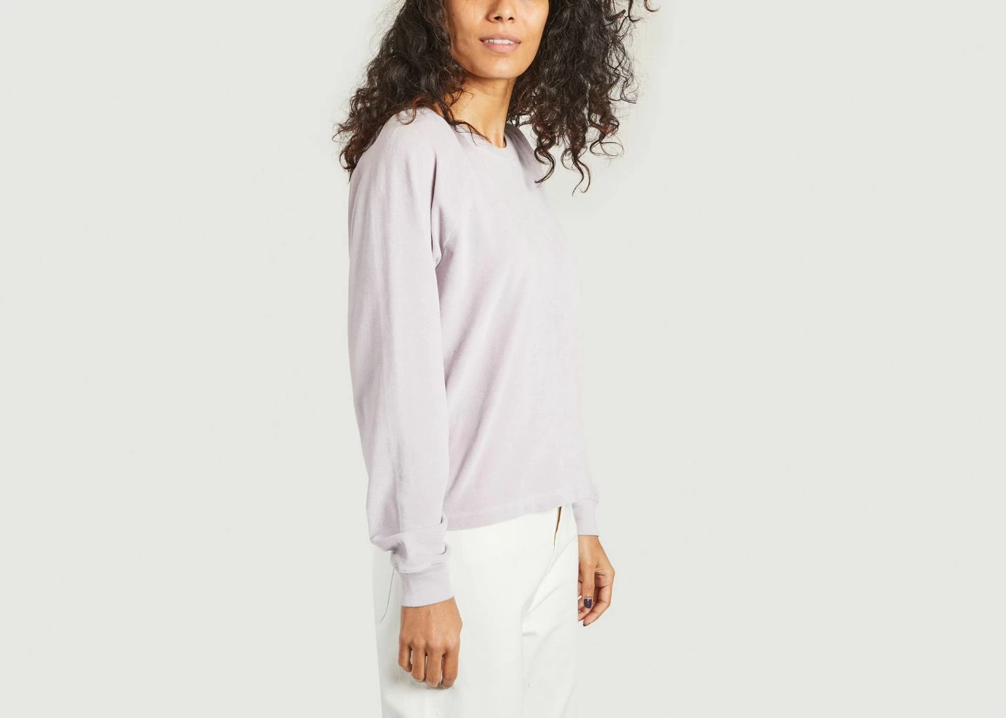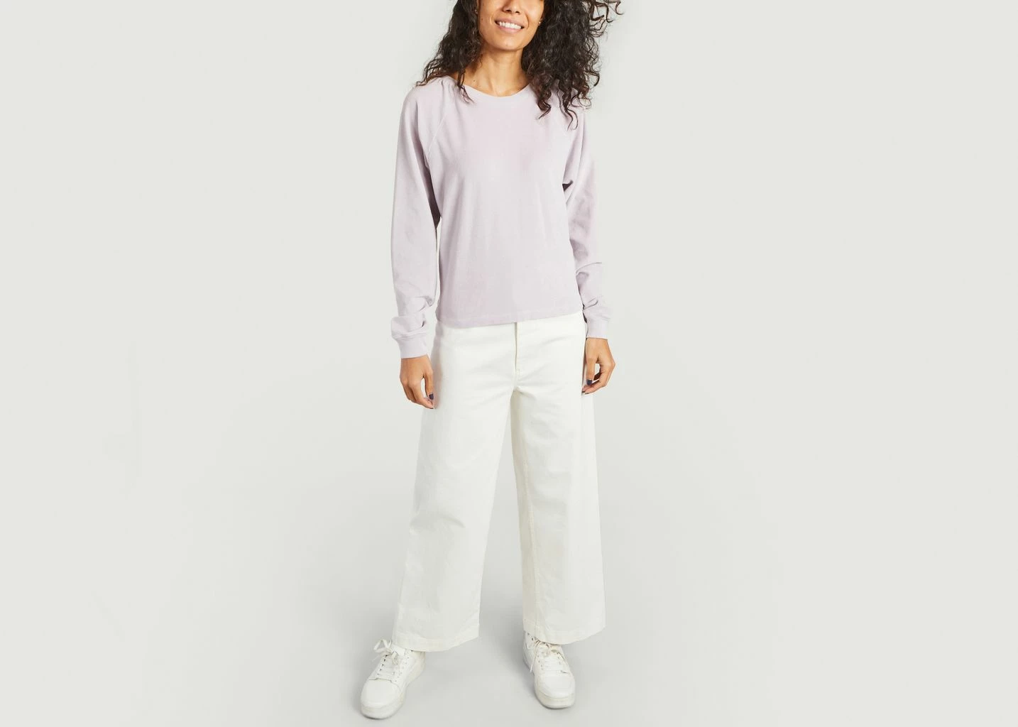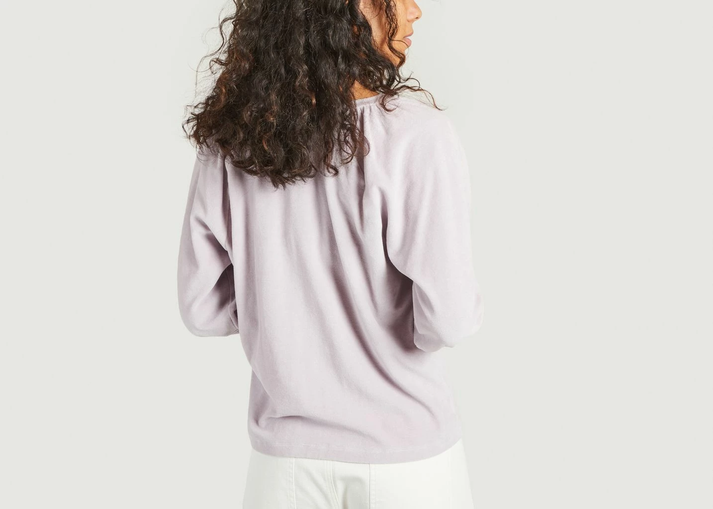 Lilac colored sweatshirt made of cotton and modal, polyamide and elastane. Featuring a straight cut, long raglan sleeves with pleats, round neck, ribbed trim. Fall for the Fellow sweater by Bellerose! This light and fluid model, with its summery color, will be easy to match every day, with jeans or a midi skirt.