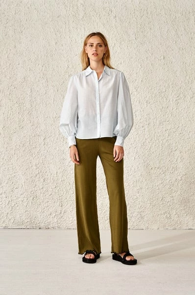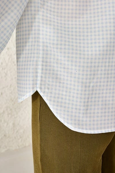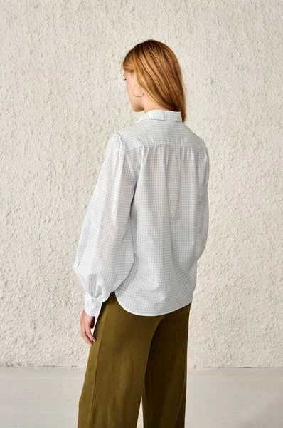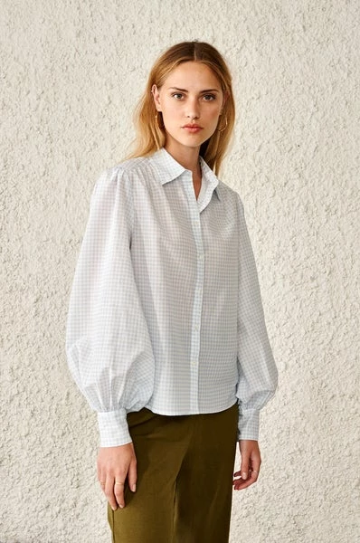 Tamara knows how to dial up the volume. Crafted from a light gingham cotton and silk blend, this blouse features voluminous puff sleeves that gather elegantly at the cuffs with a standard shirt collar on gathered yoke. We like it styled casually, untucked over a pair of boyfriend jeans or corduroys. – Pale blue check on white base – Puff sleeves – Lightweight cotton and silk blend – Curved hem – Large shirt collar – Dropped hem at the back.