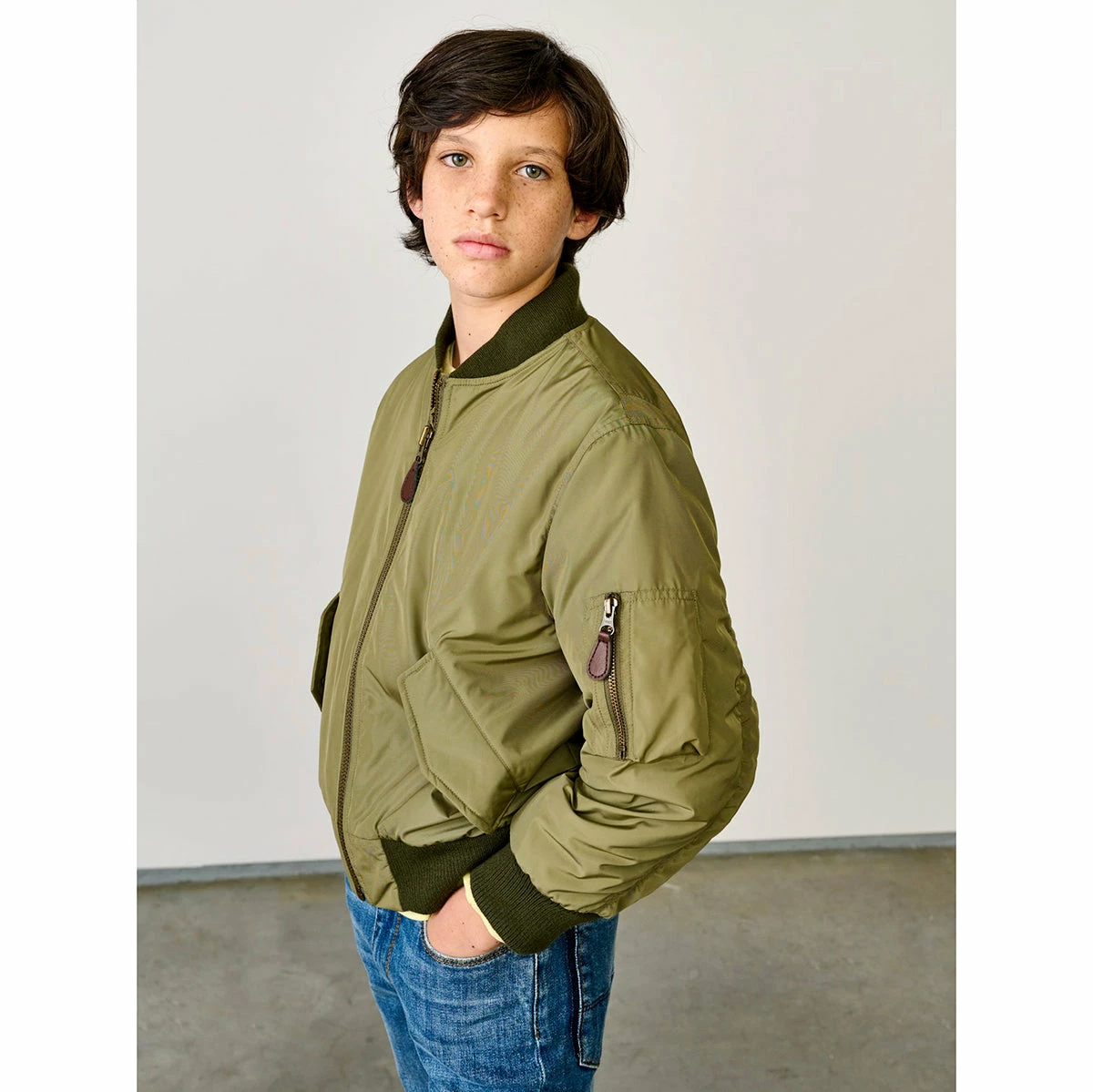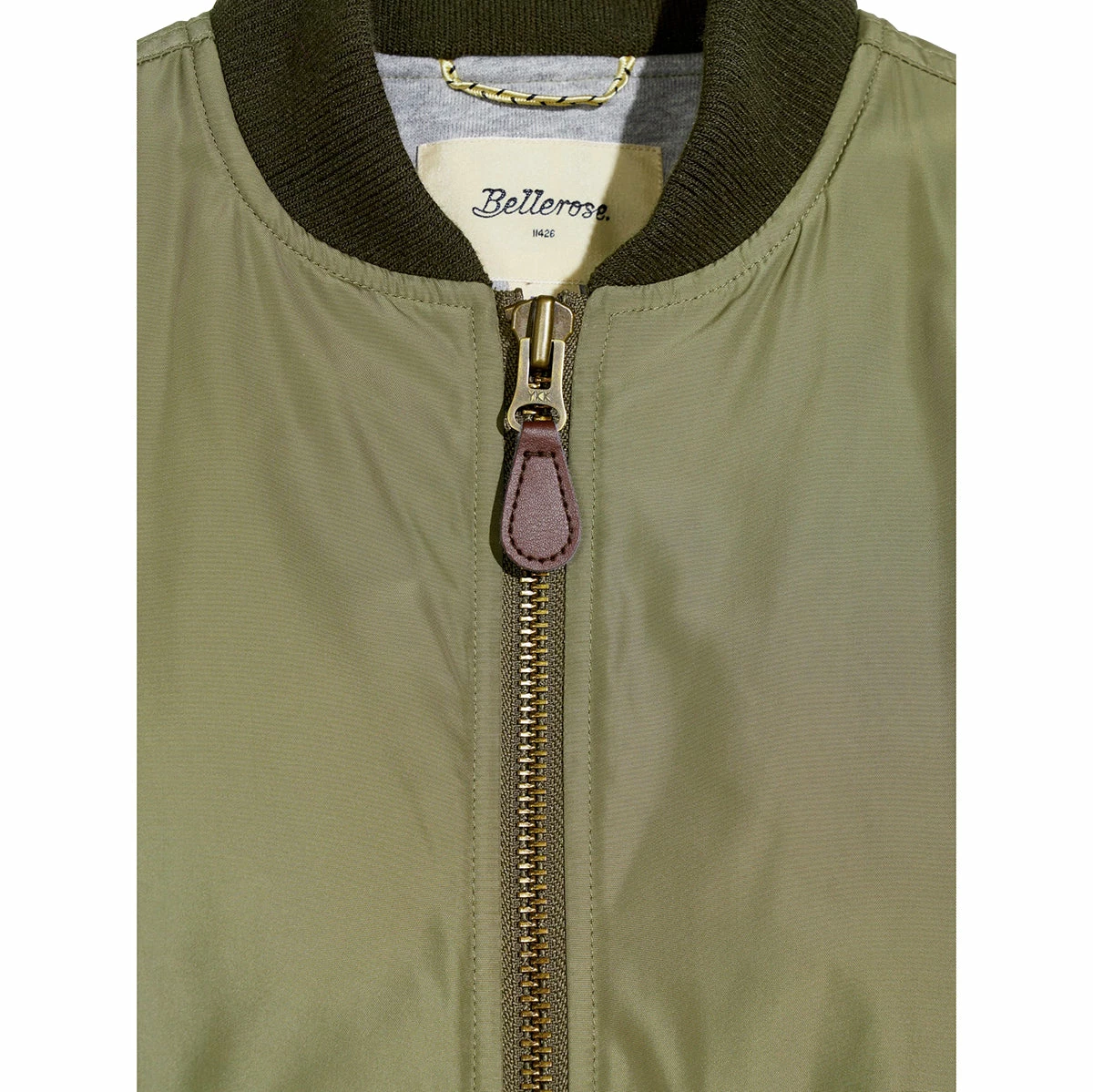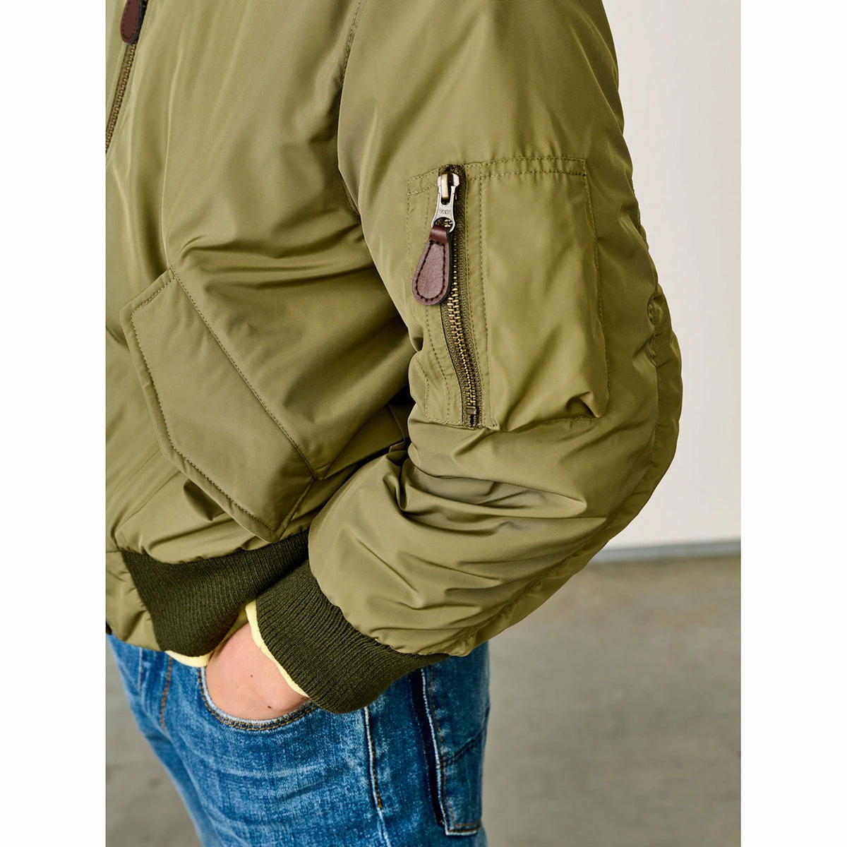 Inspired by the look of the bomber jacket, the Hanyh jacket from Bellerose mixes our love for the US way of style with our own Bellerose touch. With a classic jeep green outer in shiny polyester and jersey fleece lining for extra comfort, flap side pockets, ribbed edges, zipped front, and an extra zipped pocket on the right arm for his knick-knacks, this timeless jacket is styled to a T! Details: Varsity style jacket | Ribbed cuffs, collar, and waistline | Metal front zip | Patched and zipped pocket on the sleeve Colour: Jeep Composition: 100% polyester | Sleeve lining: 100% polyamide/nylon | Ribknit: 85% cotton, 13% polyester, 2% elastane Care details: Machine wash at 30°C or lower, low bleach allowed, do not fill the drum, delicate spinning | Do not bleach | Do not tumble dry | Do not iron | Do not dry clean
