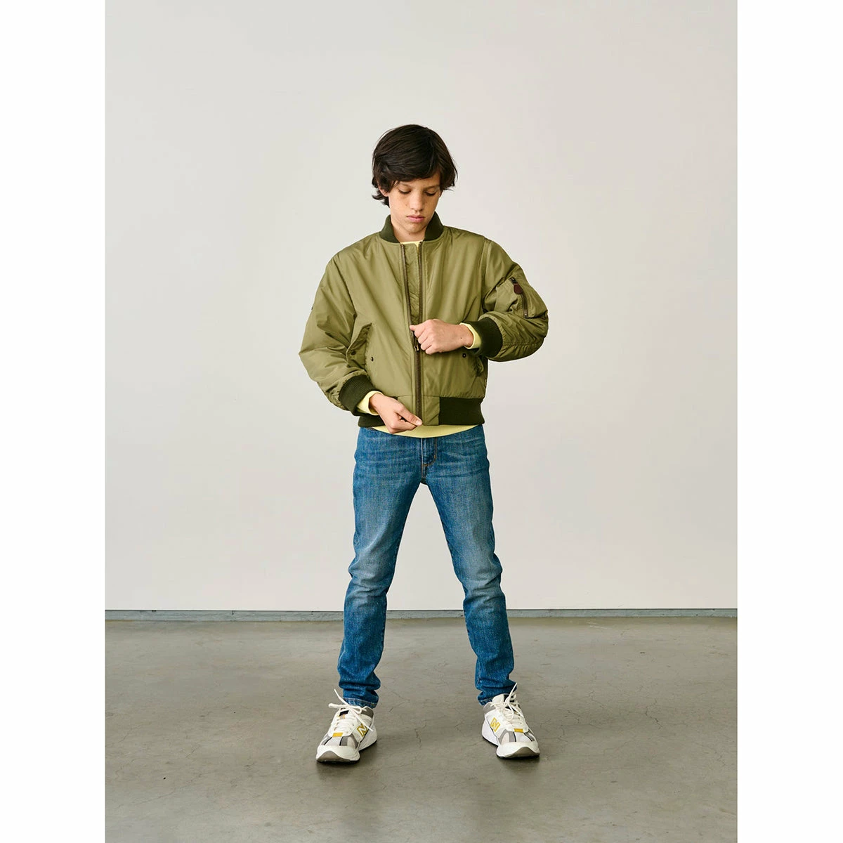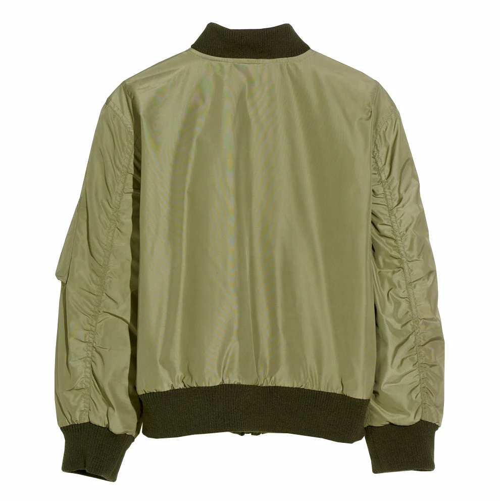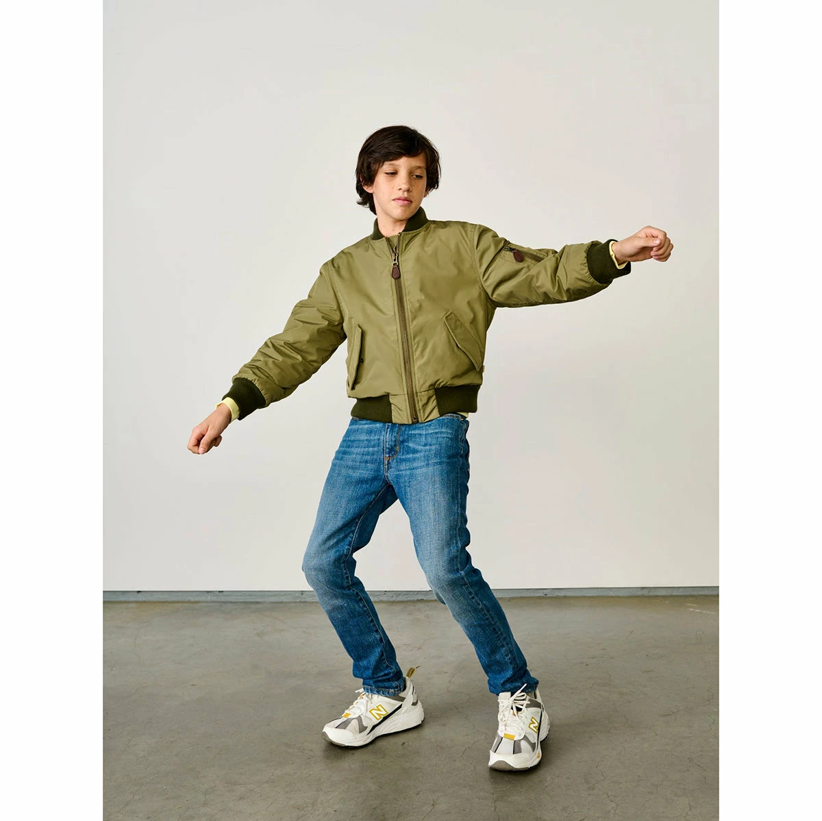 Inspired by the look of the bomber jacket, the Hanyh jacket from Bellerose mixes our love for the US way of style with our own Bellerose touch. With a classic jeep green outer in shiny polyester and jersey fleece lining for extra comfort, flap side pockets, ribbed edges, zipped front, and an extra zipped pocket on the right arm for his knick-knacks, this timeless jacket is styled to a T! Details: Varsity style jacket | Ribbed cuffs, collar, and waistline | Metal front zip | Patched and zipped pocket on the sleeve Colour: Jeep Composition: 100% polyester | Sleeve lining: 100% polyamide/nylon | Ribknit: 85% cotton, 13% polyester, 2% elastane Care details: Machine wash at 30°C or lower, low bleach allowed, do not fill the drum, delicate spinning | Do not bleach | Do not tumble dry | Do not iron | Do not dry clean