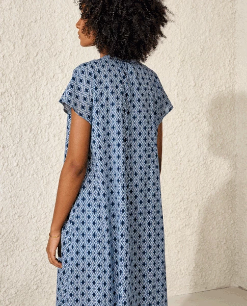 Bellerose Vasco Dress, a blue printed cotton sundress with short flutter sleeves and a rounded v neck. Super easy to wear this Summer holiday cover up falls to the ankle in length the lightweight Vasco dress has two small black buttons below the v neck. 100% Cotton Machine wash cool Loose fitting, size down if petite
