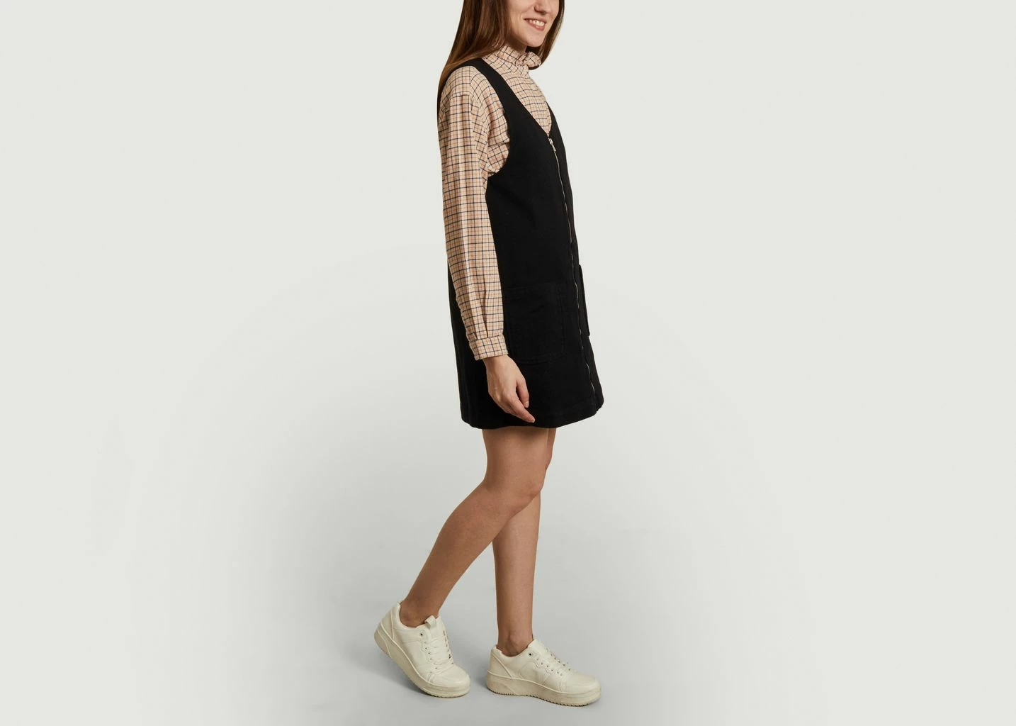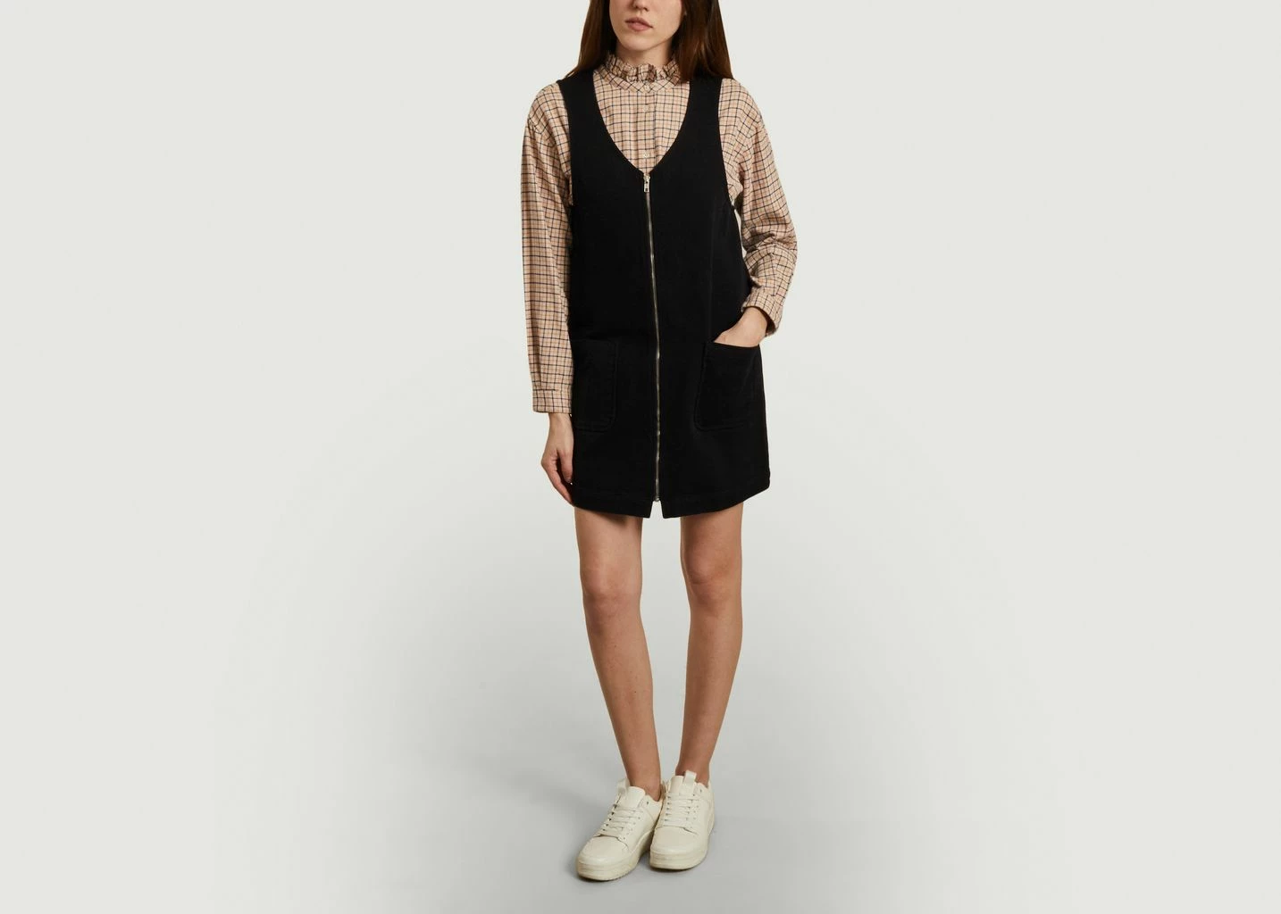 The Venty Dress is made of cotton, has a mini length, offers a straight cut and large pockets. It has a V-neck and a zipper front closure. This dress is informal without being casual. The perfect dress for many occasions, wear it over your bikini for the beach or with a t-shirt and sandals for a walk in the city.