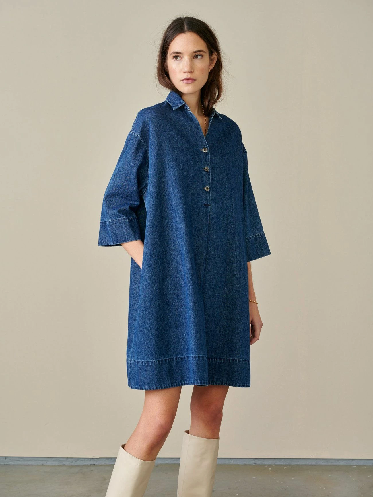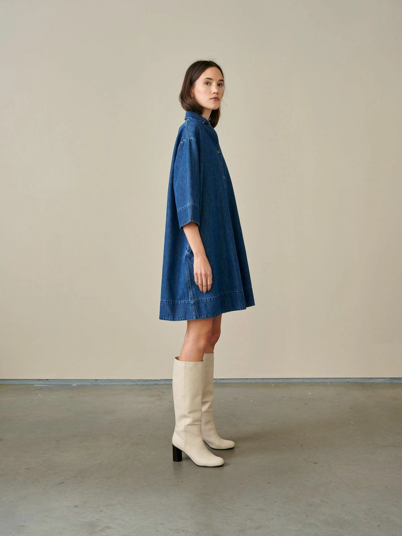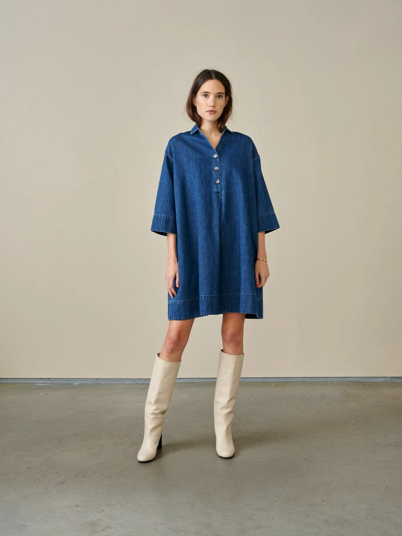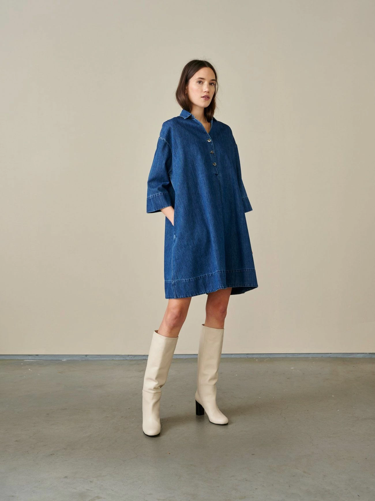 Un vero classico Bellerose. Il nostro ATELIER è un abito femminile con un taglio ampio e oversize, colletto classico, lunghezza sopra il ginocchio e tasche laterali per una maggiore comodità. Ha tutta la facilità e il comfort che puoi sognare senza compromettere lo stile e questa stagione il denim è disponibile in una versione senza tempo che sappiamo amerai. Indossalo casualmente con un paio di Chelsea boots o di sneakers. In alternativa, osa andare all in e tira fuori i tuoi tacchi preferiti per un giro! Sarà fantastico in ogni caso.