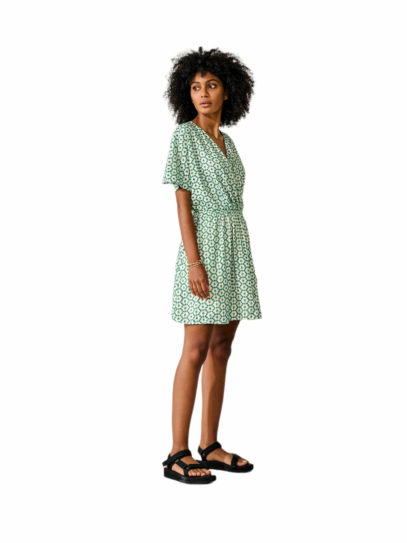 Hamimi Dress, un abito corto ricamato verde e bianco con scollo a V ampio, maniche corte larghe. Completo di tasche ed elastico in vita, il mini dress Hamimi è leggero e arioso per l’estate. 70% viscosa e 30% poliestere Lavare in lavatrice a 30°