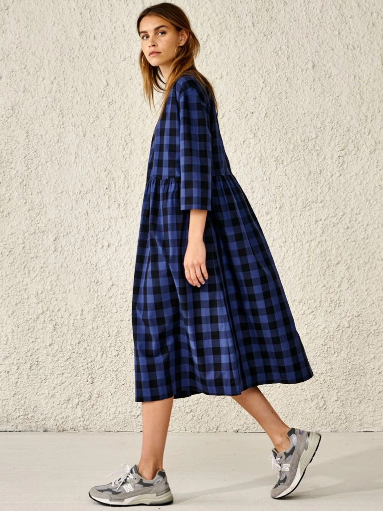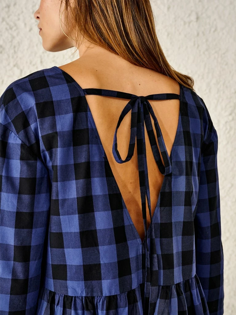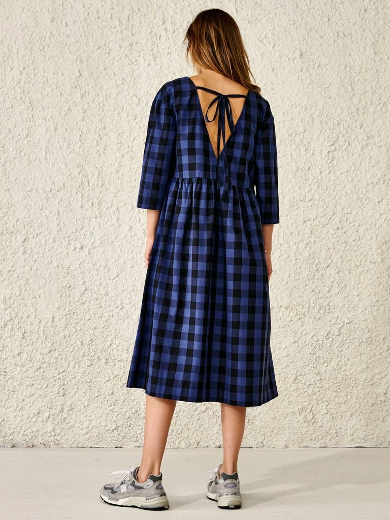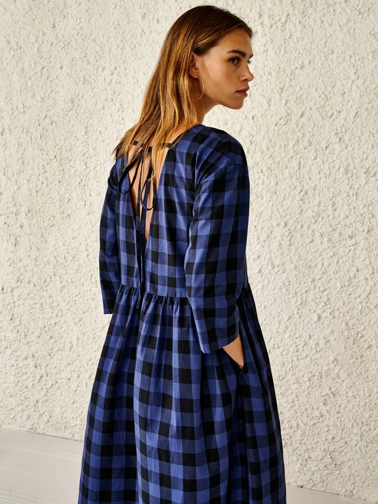 Casual yet feminine, the Vida Dress from Bellerose makes quite a statement with its oversized cut and deep V in the back secured by a self-tie ribbon. Crafted from pure cotton in black/blue gingham print, it features an almost empire waistline, elbow-length sleeves, and gathered details. 100% cotton Oversized dress Elbow length sleeves Deep V secured by a self-tie ribbon in the back Gathered details Olivia is 174 cm tall and wears a size 8