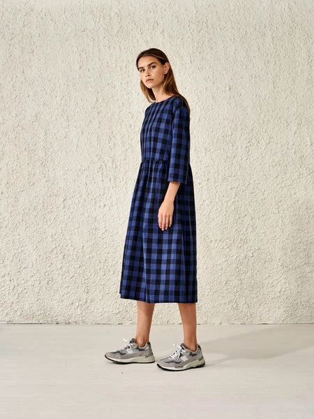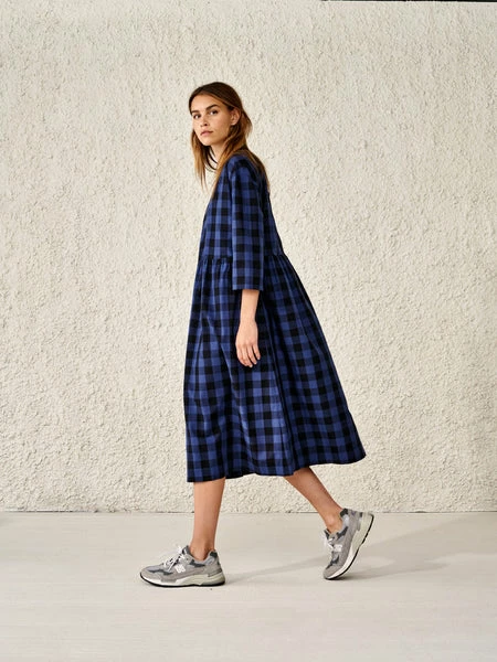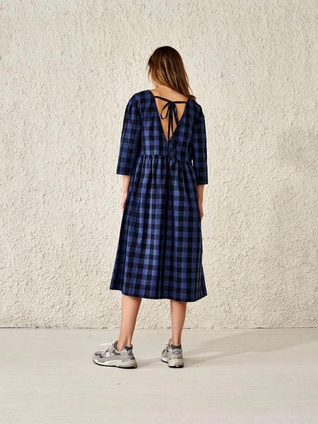 Casual yet feminine, the Vida dress makes quite a statement with its oversized cut and deep V in the back secured by a self-tie ribbon. Crafted from pure cotton in black/blue gingham print, it features an almost empire waistline, elbow-length sleeves, and gathered details. Wear it loose with a pair of sneakers on an early spring day. Sizing: 0 (XS) 1 (S) 2 (M) 3 (L) 100% Cotton Made in Europe Machine wash at 40°C or lower Do not bleach Tumble dry at 50°C or lower Iron at low temperature/heat 110°C Dry clean