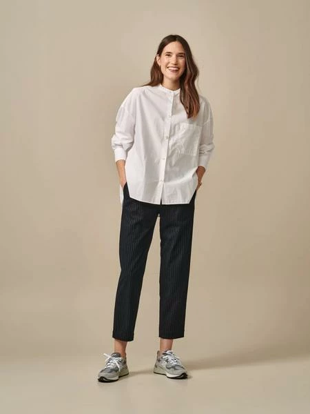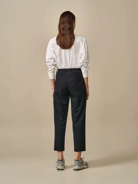 Comfortable yet stylish trousers from Bellerose. They have a high waist and tapered leg with zip and button close as well as elasticated waist. Perfected with side pockets as well as back slit pockets and we love this dark navy pinstriped version. Style with a white shirt or maybe your favourite knit; you can’t go wrong. Sizing:0 (XS)1 (S)2 (M)3 (L) 4 (XL) 69% polyester, 29% viscose, 2% elastane Made in Europe 30 degrees machine wash on delicate cycle, Do not bleach, Do not tumble dry, Iron at medium temperature / Heat 150°C