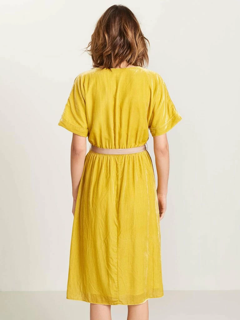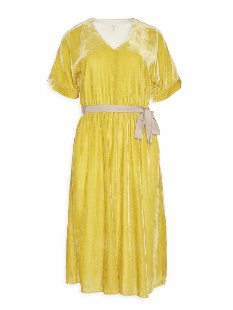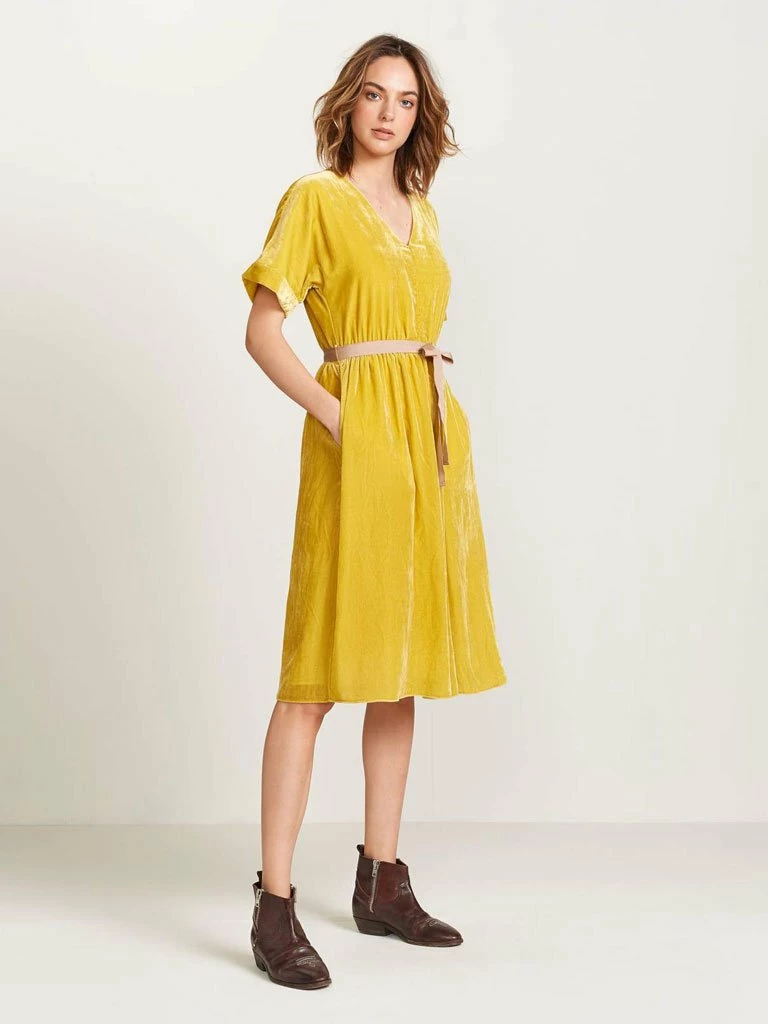 A Bellerose staple, the Hoek Dress is always a winner and this season comes in a wonderful, vibrant Pollen yellow. Cut with a flattering v-neck, this velvet-feel dress is mid length, has folded short sleeves that hit just above the elbow, a gathered waist with ribbon tie belt, and is fully lined with white fabric. A staple in your wardrobe, this dress will see you through the autumn and into the cooler winter months. 75% viscose, 25% polyamide/nylon Lining: 100% viscose Belt: 100% viscose V neckline Gathered waist with tie belt Made in China Handwash cool Do not tumble dry