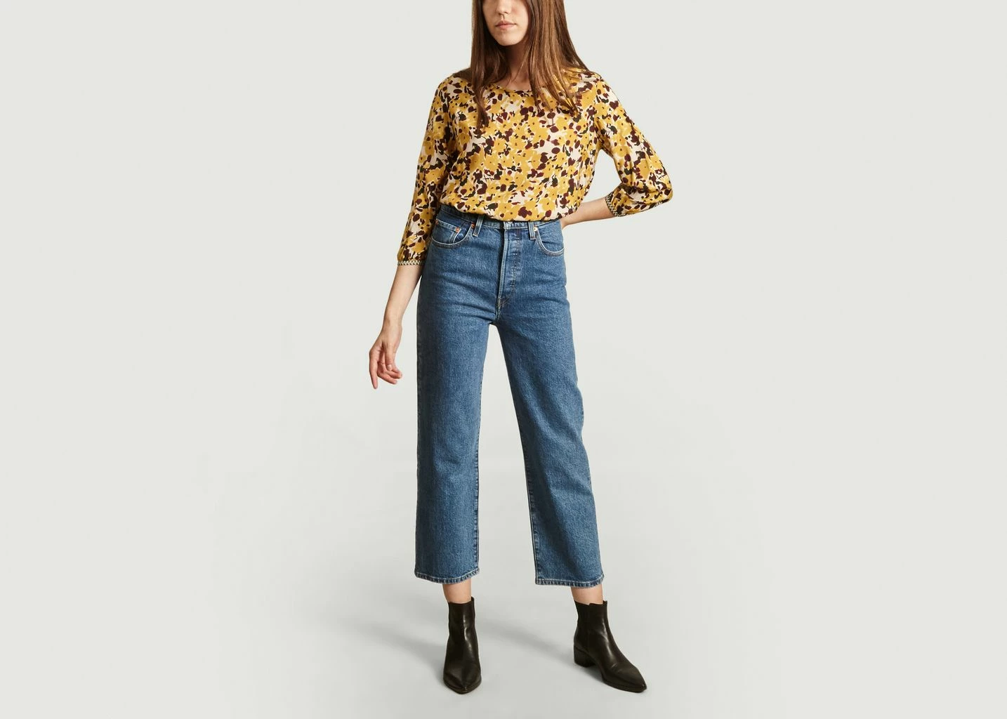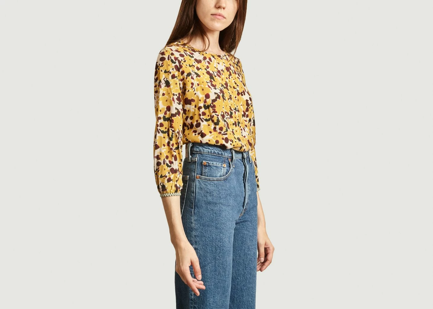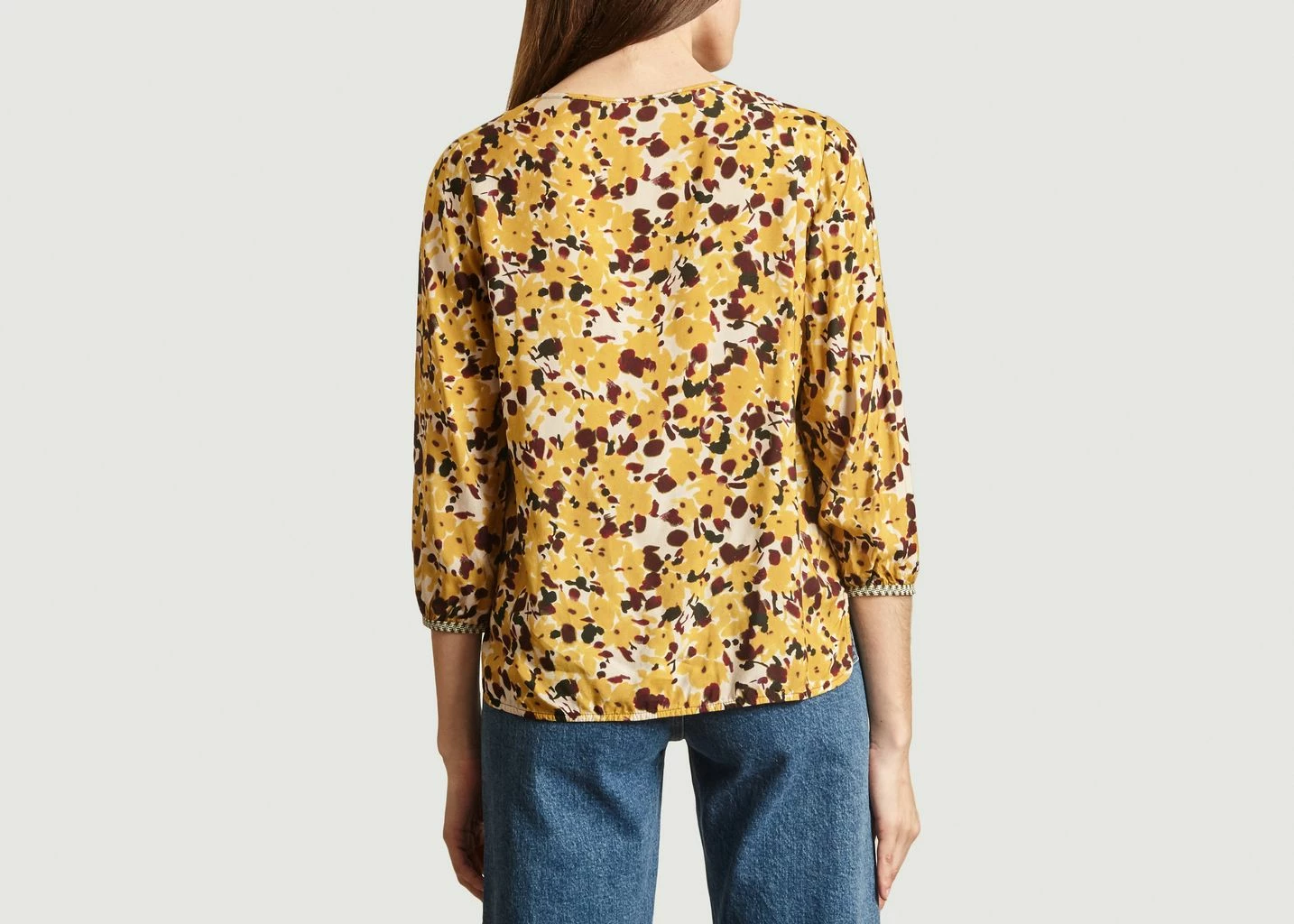 Viscose blouse with yellow/red floral print on an ecru background, straight cut, 3/4 sleeves with striped stretch polyester edges, round neck.